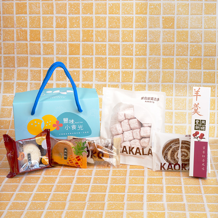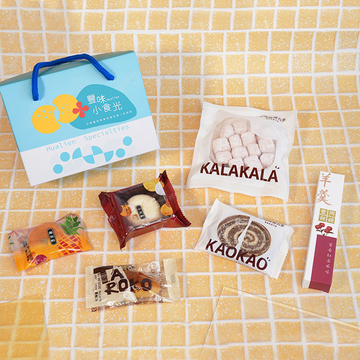 花蓮薯1入+小月餅1入+鳳梨酥1入+KAO鏍雷餅乾1入+KALA礦石餅乾1入+茶羊羹1入